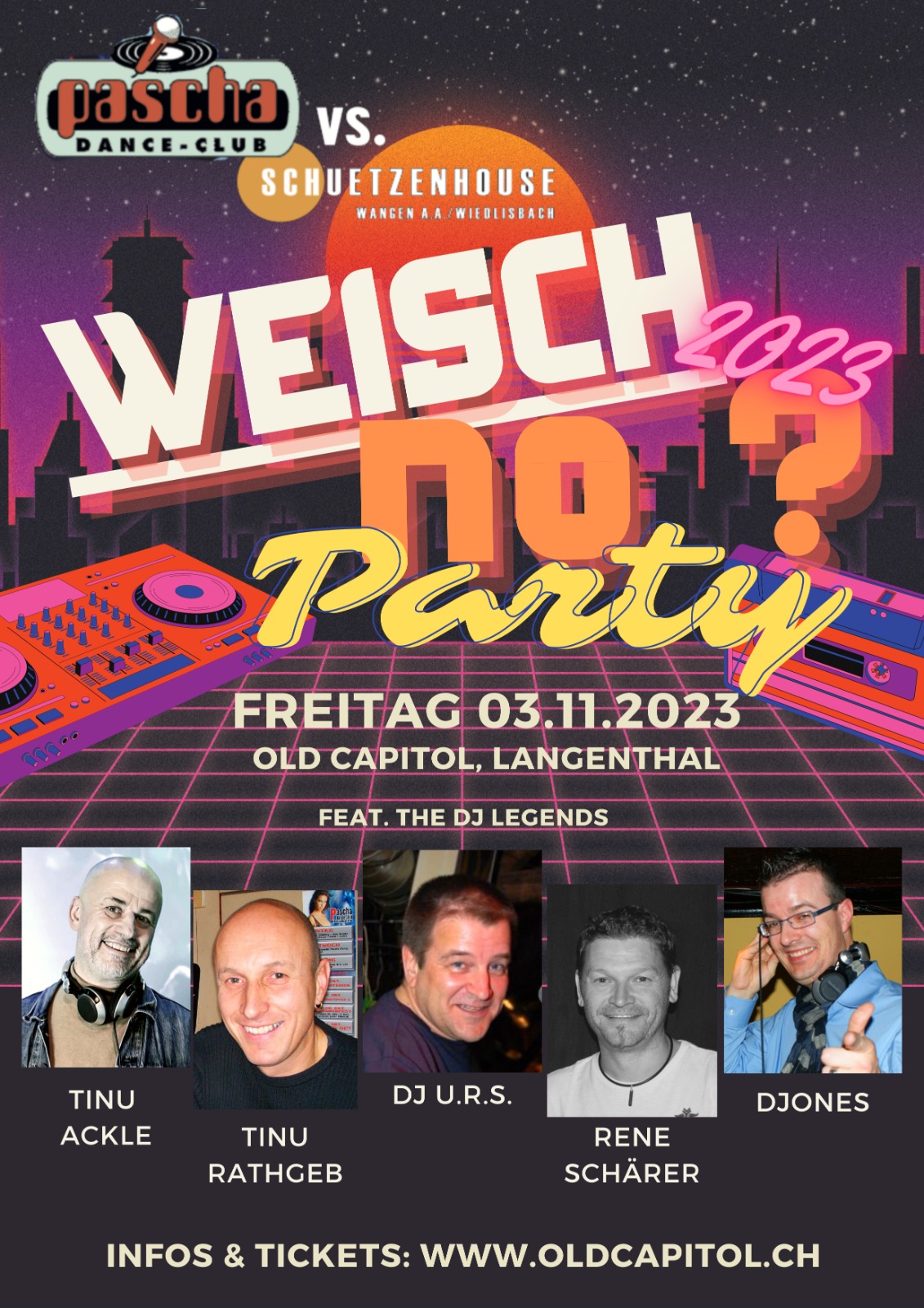 Wer in den 80er und 90er Jahren im Oberaargau in den Ausgang wollte, musste nicht weit fahren. Man traf sich im Crystal Palace in Langenthal, im Pascha Club in Bützberg oder im Schützenhouse in Wangen an der Aare. Es gab noch keine Handys, kein Internet und keine Dating Apps. Wer jemanden kennen lernen wollte, musste tanzen gehen. In den Discotheken der Region verliebte man sich, Paare fanden zusammen und Freundschaften für’s Leben wurden geschlossen. Es war eine tolle Zeit – und die möchten wir mit der «WEISCH NO» Party wieder einmal aufleben lassen. Ein Abend mit den legendären DJs von damals und hoffentlich vielen ehemaligen und neuen Party-Freaks – ein Klassentreffen der besonderen Art.