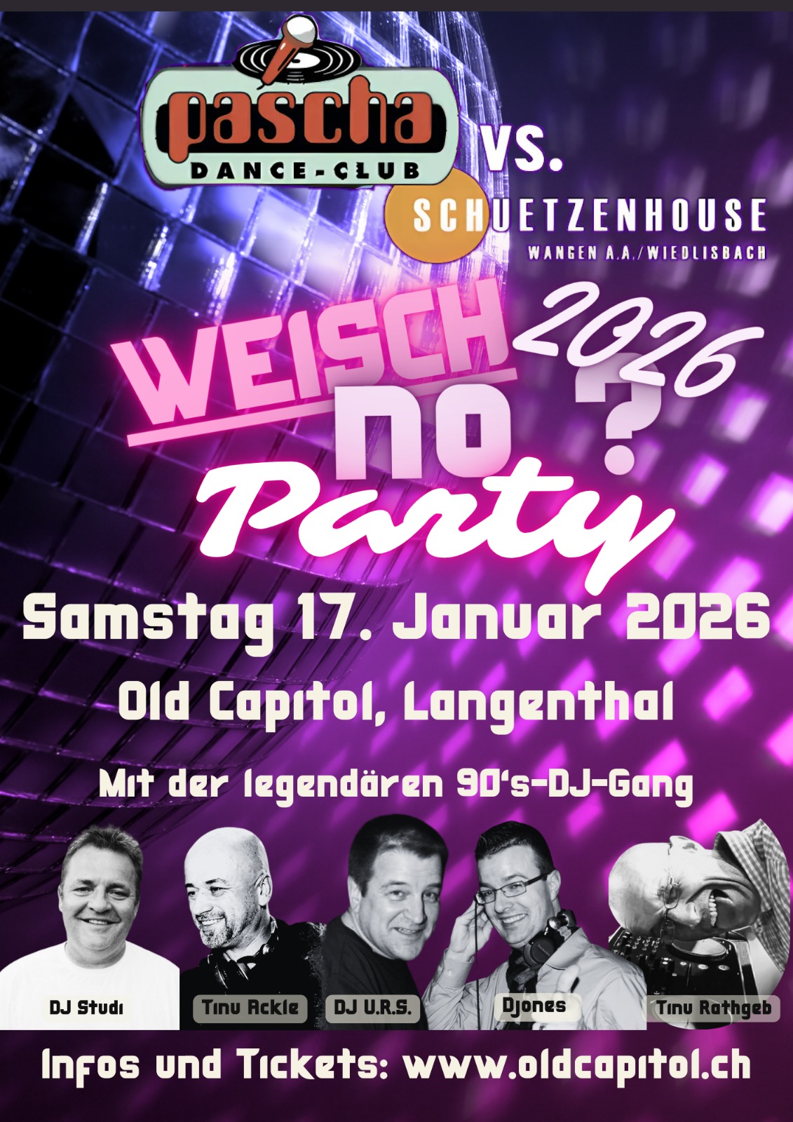 Wer in den 80er und 90er Jahren im Oberaargau in den Ausgang wollte, musste nicht weit fahren. Man traf sich im Crystal Palace in Langenthal, im Pascha Club in Bützberg oder im Schützenhouse in Wangen an der Aare. Es gab noch keine Handys, kein Internet und keine Dating Apps. Wer jemanden kennen lernen wollte, musste tanzen gehen. In den Discotheken der Region verliebte man sich, Paare fanden zusammen und Freundschaften für’s Leben wurden geschlossen. Es war eine tolle Zeit – und die möchten wir mit der «WEISCH NO» Party wieder einmal aufleben lassen. Ein Abend mit den legendären DJs von damals und hoffentlich vielen ehemaligen und neuen Party-Freaks – ein Klassentreffen der besonderen Art.